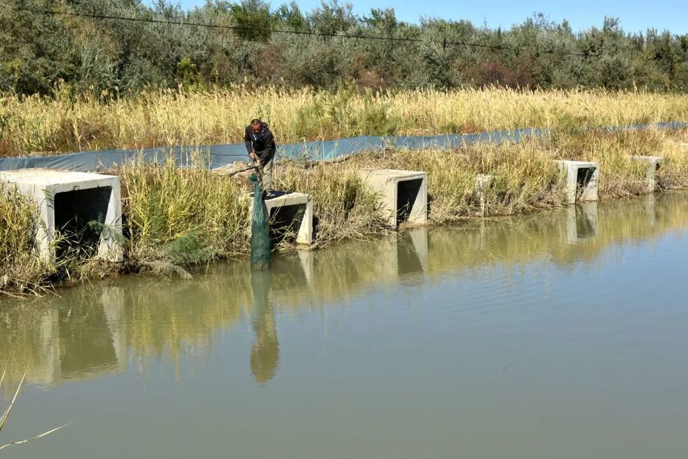 近日,在142团7连钱鑫种植专业合作社的鱼池中,合作社负责人宋洪卫正与工人一起收网捕捞螃蟹。