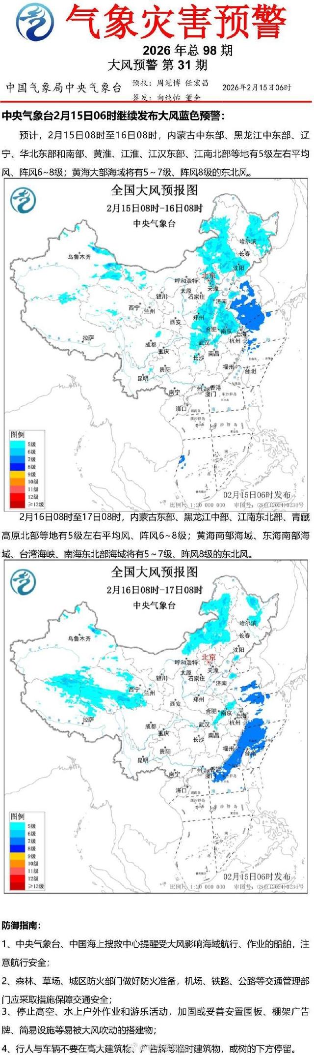 中央气象台2月15日06时继续发布大风蓝色预警。