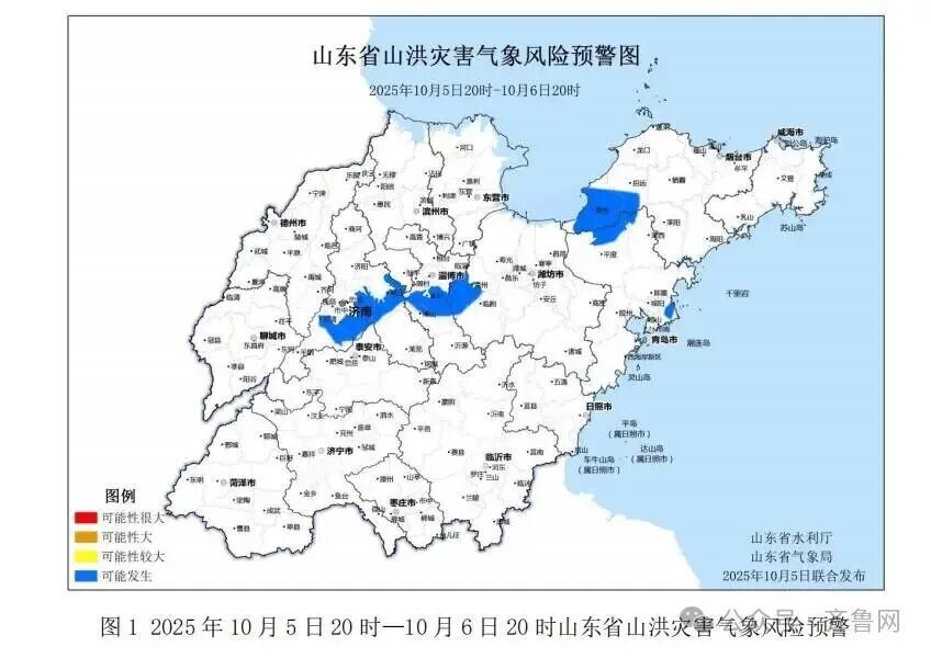 预计10月5日20时至10月6日20时,济南、青岛、淄博、烟台、潍坊等市局部地区可能发生山洪灾害(蓝色预警)。