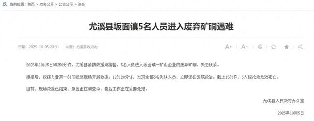 2025年10月5日9时50分许,尤溪县消防救援局接警,5名人员进入坂面镇一矿山企业的废弃矿硐,失去联系。