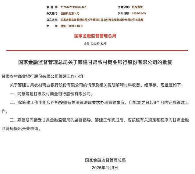 2月13日,国家金融监管总局发布批复显示,同意筹建甘肃农村商业银行股份有限公司(以下简称“甘肃农商银行”),批复时间为2月9日。