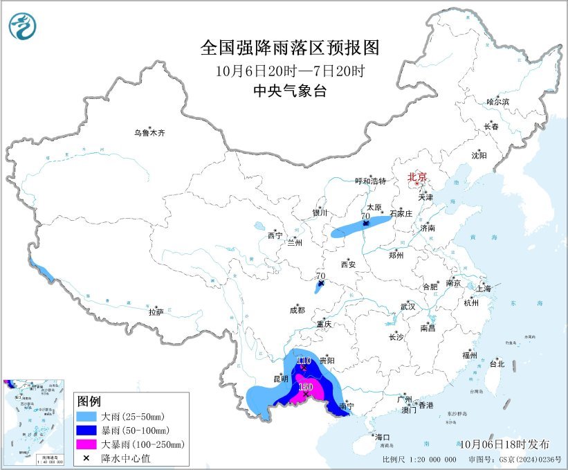 预计,10月6日20时至7日20时,广西西部、贵州西部、云南东部和南部等地有大到暴雨,部分地区有大暴雨(100~150毫米);上述部分地区伴有短时强降水,最大小时降雨量20~40毫米,局地可超过50毫米;此外,四川盆地北部、陕西中部、山西中部等地部分地区有大雨,局地有暴雨。