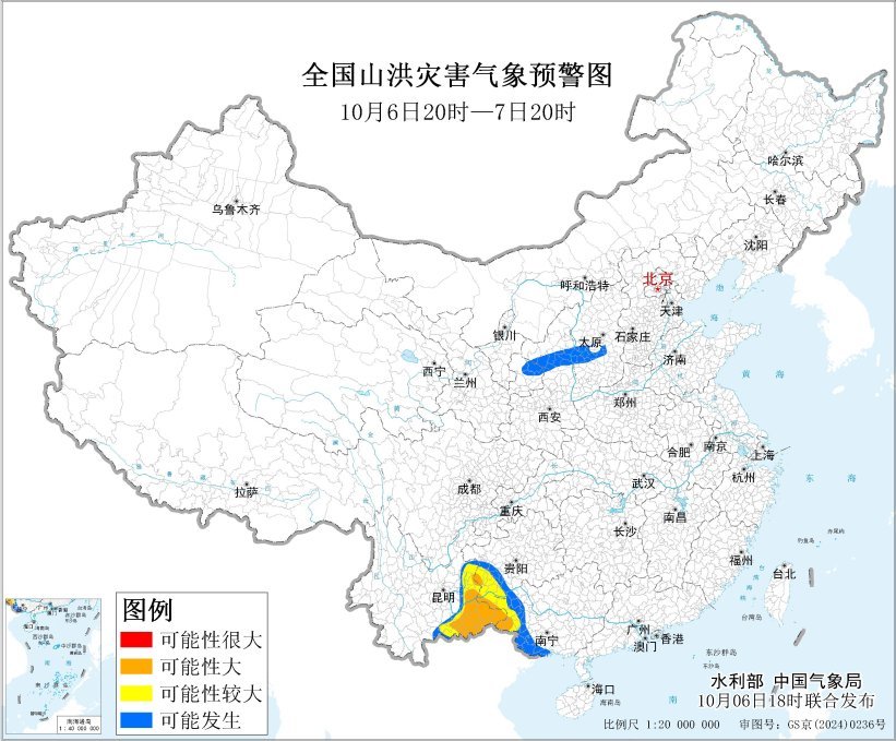 预计,10月6日20时至7日20时,广西西部、贵州西南部、云南东部等地部分地区发生山洪灾害可能性较大(黄色预警),其中,局地发生山洪灾害可能性大(橙色预警)。其他地区也可能因局地短历时强降水引发山洪灾害,请各地注意做好实时监测、防汛预警和转移避险等防范工作。