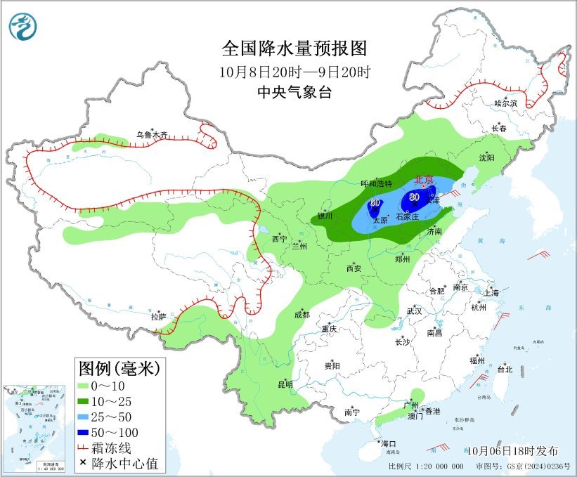 10月8日20时至9日20时,西北地区东部、华北、黄淮西部和北部及四川、云南等地有小到中雨,其中陕西北部、山西及河北等地的部分地区有大雨,局地暴雨(见图4)。