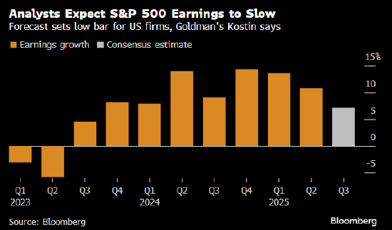 分析师预计,标普500指数成分股企业第三季度利润增长7.2%,为两年最低增幅。销售增速也可能从前一季度的6.4%放缓至5.9%。