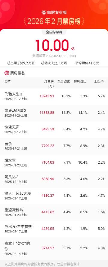 据猫眼专业版数据,2月16日11时,2026年2月总票房破10亿,《飞驰人生3》《疯狂动物城2》《惊蛰无声》分列2月票房榜前三位。