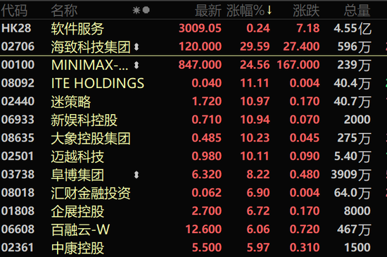 海致科技集团涨近30%、MINIMAX-WP涨超24%,迈越科技涨超10%,阜博集团涨超8%,智谱上涨4.74%。