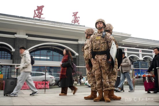 新春佳节期间,春运客流持续高位运行,车站作为人员密集重点区域,维稳安保执勤任务艰巨繁重。武警贵州总队安顺支队、遵义支队官兵主动担当作为,分赴安顺西站、遵义高铁站等重点点位,联合公安部门开展执勤值守、安全防控等工作,全力守护群众出行安全。
