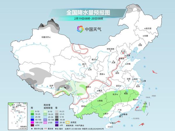 明天,新疆南疆盆地、西藏西部和东南部、青海西部、川西高原北部等地部分地区有小到中雪或雨夹雪。江南西部、西南地区东部、华南北部和西部、台湾岛等地部分地区有小到中雨。