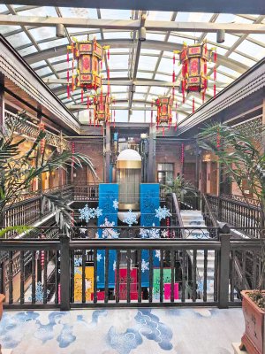 记者来到道外南三道街21号巴洛克酒店,看到酒店的玻璃门上贴有“方正剪纸”作品。穿过门洞进入酒店大堂,光线透过玻璃顶棚柔和地洒到地面。酒店三层设有中式围廊,大堂的木制楼梯直通楼上,楼梯旁配有观光电梯,空间高挑开阔。