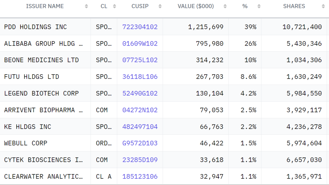 中概股依旧是HHLR Advisors的核心配置资产。截至2025年末,在前十大重仓股中,中概股占据七席,市值占比高达92%,持仓进一步聚焦于互联网电商龙头、生物医药和金融科技领域。具体来看,前十大重仓股分别为拼多多、阿里巴巴等企业。