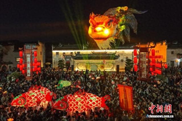 2月20日,在安徽省黄山市徽州区唐模古村落,巨型鳌鱼灯在夜空中飞旋。流光溢彩的场景吸引众多游客和市民驻足围观。图为游客在欣赏“鳌鱼飞天”巡游表演。(无人机照片)施亚磊 摄