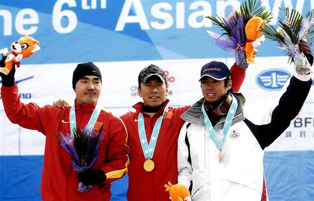 2007年亚冬会,夺冠的韩晓鹏(中)和摘银的邱森(左)同样来自沛县(新华社)