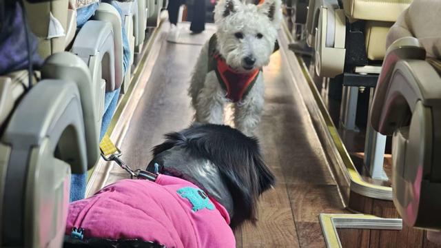 刚上大巴,几只小狗便因陌生环境起了争执,犬吠声此起彼伏。想要让一只小狗安静下来,难度并不亚于安抚哭闹的婴儿。但随行的家长们显然经验十足:缓解焦虑的零食、漏食球、情绪舒缓喷剂、宠物背包等一应俱全。
