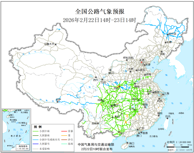图3 全国公路气象预报图(2月22日14时—23日14时)