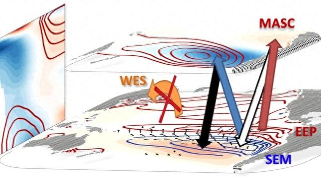 然而,在上海交大工作期间,马建与合作者发现起主导作用的并不是跨赤道反馈。他们从南北半球海温和风速的解耦现象出发,利用南太平洋海盆外的格林函数实验,颠覆了“跨赤道风—蒸发—海温反馈”机制在这个区域起主导作用的理论假说。他们提出的新机制名为“单半球倾斜风—蒸发—海温反馈”。以均匀增暖和直接辐射效应为激发点,发现南太平洋副热带高压向南迁移与增强,引起风速增强从而初步冷却海表。这个冷却信号向赤道方向传播,在传播过程中,源自海表的大气冷却在中上层受到绝热加热的阻挡。于是,中高空冷信号引起的海平面气压升高,与海表冷信号出现了约90度的南向相位差,从而形成“冷而又冷”的海气正反馈。