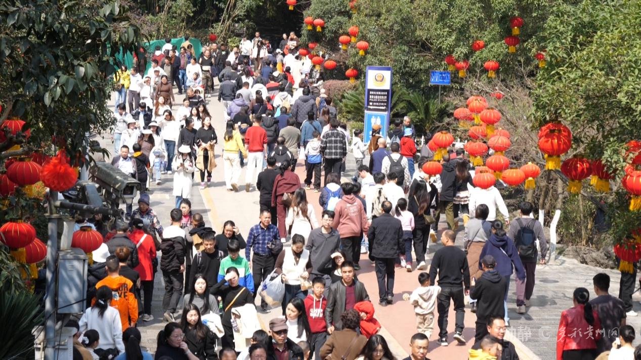 大年初五,阳光正好。还没走进黔灵山公园大门,记者就被眼前的人潮震撼到了——检票口排起长龙,欢声笑语此起彼伏,年味混着烟火气扑面而来。