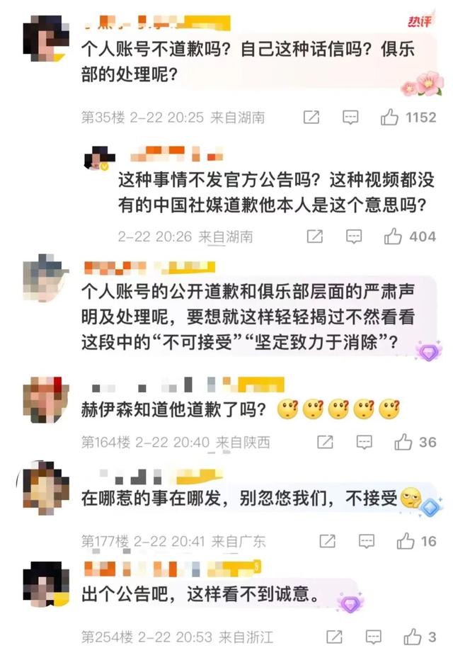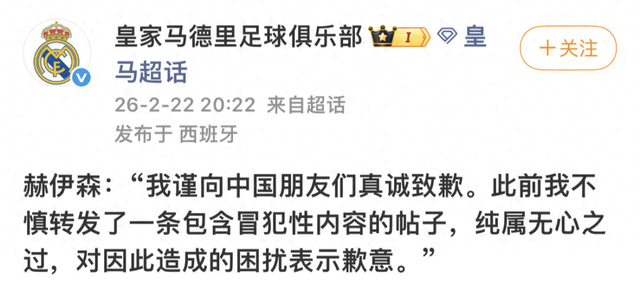 2月22日,@皇家马德里足球俱乐部 官博发布了赫伊森的道歉内容,称此事“纯属无心之过”。赫伊森:“我谨向中国朋友们真诚致歉。此前我不慎转发了一条包含冒犯性内容的帖子,纯属无心之过,对因此造成的困扰表示歉意。”