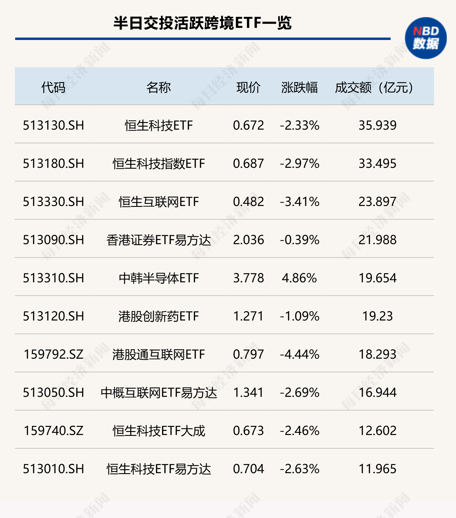 节后首个交易日,今日上午科创芯片ETF(588200)、ETF(562500)成交金额超过13亿元,电网设备ETF(159326)、卫星ETF(159206)半日成交金额超10亿元;跨境ETF方面,恒生科技ETF(513130)半日成交金额超35亿元。