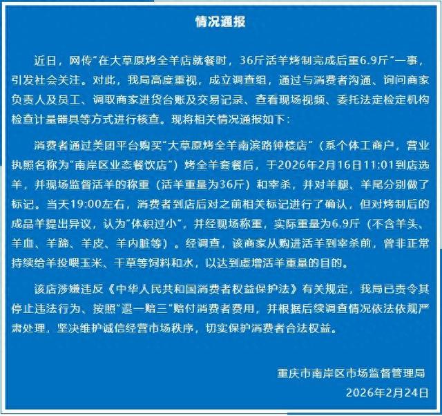 近日,网传“在大草原烤全羊店就餐时,36斤活羊烤制完成后重6.9斤”一事引发社会关注。对此,重庆市南岸区市场监督管理局成立调查组,通过与消费者沟通、询问商家负责人及员工、调取商家进货台账及交易记录、查看现场视频、委托法定检定机构检查计量器具等方式进行核查。现将相关情况通报如下: