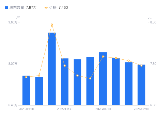 2月13日消息,数据显示,截至2026年2月10日,A股股东总户数为7.97万户,较上期(2026年1月31日)减少927户,降幅1.15%。公司最新A股总股本为26.49亿股,其中流通A股16.81亿股,户均持有流通A股数量为2.11万股,较上期增加242.32股,增幅1.16%;户均持流通A股市值15.73万元,较上期减少693.2元,降幅0.44%。