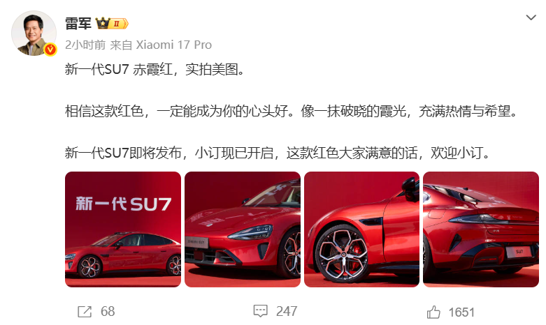 2月24日,小米创始人、董事长雷军在微博上发文,公布了新一代SU7全新配色——赤霞红。据雷军介绍,这款赤霞红配色的灵感取自破晓时刻的霞光,以正红色漆为基底,并融入细微的金属鳞片。他还表示,新一代SU7即将发布,小订已经开启,“这款红色大家满意的话,欢迎小订”。