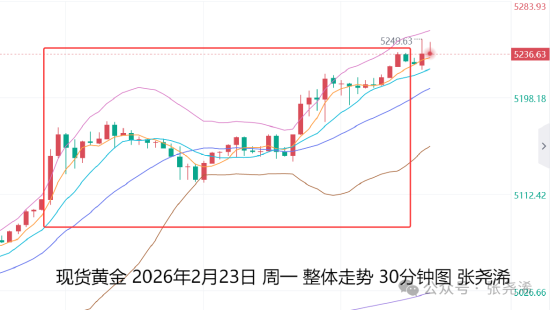 2月24日:上交易日周一(2月23日):国际黄金继续反弹走强收阳,特朗普宣布将临时关税上调至15%,带动了避险需求,令其保持在中轨及短期均线上方运行,虽然主图ZZ指标显示反弹触顶,有回落风险,但附图指标转强,主图各均线也多头排列,基本面也未有持续且较大的利空因素,故此,如有回落,下方关注各均线支撑,也是继续入场看涨的机会。