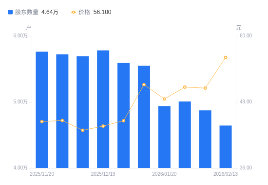 2月24日消息,数据显示,截至2026年2月13日,A股股东总户数为4.64万户,较上期(2026年2月10日)减少2304户,降幅4.73%。公司最新A股总股本为3.52亿股,其中流通A股1.92亿股,户均持有流通A股数量为4139.95股,较上期增加195.7股,增幅4.96%;户均持流通A股市值23.23万元,较上期增加3.3万元,增幅16.55%。