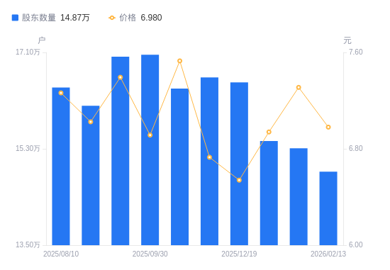 2月25日消息,数据显示,截至2026年2月13日,A股股东总户数为14.87万户,较上期(2026年1月30日)减少4384户,降幅2.86%。公司最新A股总股本为56.77亿股,其中流通A股56.77亿股,户均持有流通A股数量为3.82万股,较上期增加1092.92股,增幅2.95%;户均持流通A股市值26.64万元,较上期减少4607.06元,降幅1.70%。