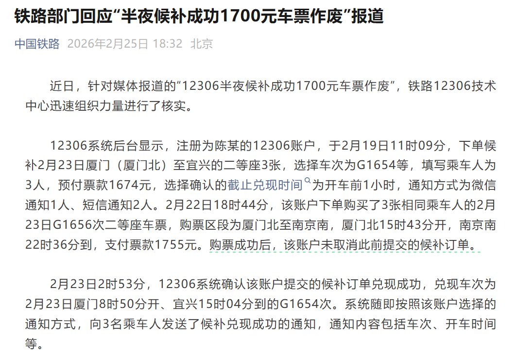 2月25日,中国铁路微信公众号发文称,近日,针对媒体报道的“12306半夜候补成功1700元车票作废”,铁路12306技术中心迅速组织力量进行了核实。
