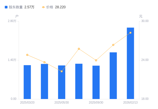 2月25日消息,数据显示,截至2026年2月13日,A股股东总户数为2.57万户,较上期(2025年11月28日)增加8905户,增幅53.10%。公司最新A股总股本为4.17亿股,其中流通A股1.22亿股,户均持有流通A股数量为4754.46股,较上期减少2524.5股,降幅34.68%;户均持流通A股市值13.42万元,较上期减少5.76万元,降幅30.02%。
