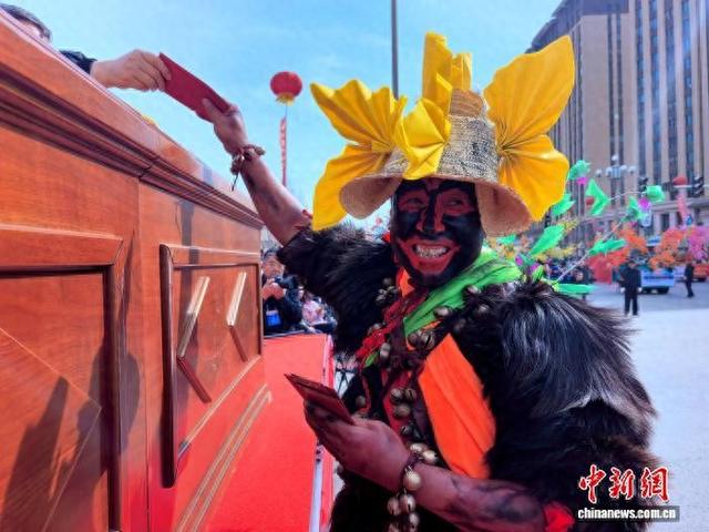 2月26日,“百龙千狮闹新春”河湟非遗大会暨挑战“最大规模的社火表演”吉尼斯世界纪录称号活动在青海省海东市乐都区举办。掌灯太傅舞、安昭、回族宴席曲、藏族螭鼓舞等传统社火表演逐一亮相。经吉尼斯世界纪录认证官认定,最终确认有效参与人数为3456人,成功挑战“最大规模的社火表演”吉尼斯世界纪录。图为传统社火中“哑巴”角色与观众互动。李隽 摄