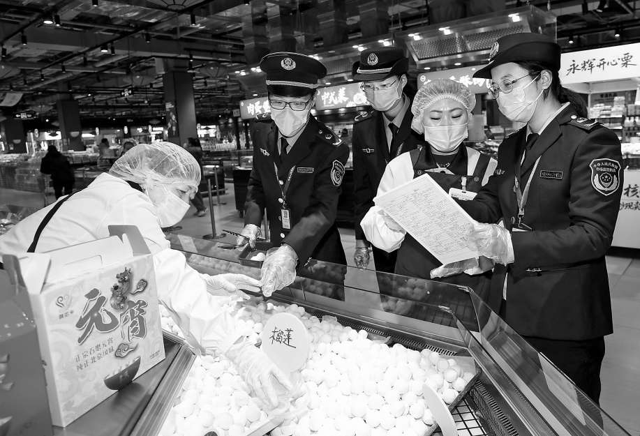 近日,北京市石景山区市场监管部门开展元宵食品专项检查行动。在各大商超、老字号食品店,执法人员仔细查看所售元宵食品的进货来源、供货方资质等,确保食品质量安全可靠。 本报记者董芳忠摄影报道