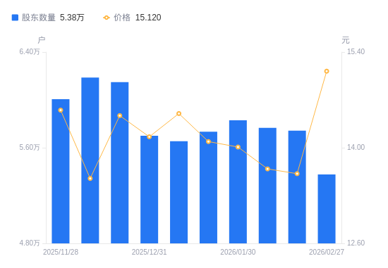 3月2日消息,数据显示,截至2026年2月27日,A股股东总户数为5.38万户,较上期(2026年2月13日)减少3663户,降幅6.38%。公司最新A股总股本为6.29亿股,其中流通A股6.29亿股,户均持有流通A股数量为1.17万股,较上期增加746.74股,增幅6.81%;户均持流通A股市值17.7万元,较上期增加2.77万元,增幅18.58%。