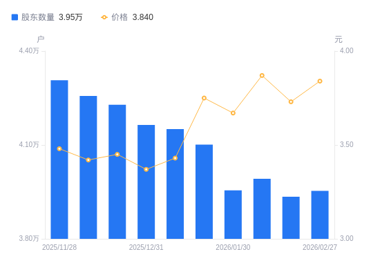 3月2日消息,数据显示,截至2026年2月27日,A股股东总户数为3.95万户,较上期(2026年2月13日)增加188户,增幅0.48%。公司最新A股总股本为13.35亿股,其中流通A股13.35亿股,户均持有流通A股数量为3.38万股,较上期减少161.37股,降幅0.48%;户均持流通A股市值12.97万元,较上期增加3112.94元,增幅2.46%。