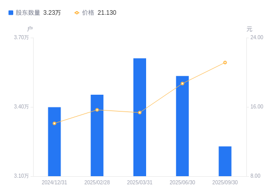 10月20日消息,数据显示,截至2025年9月30日,A股股东总户数为3.23万户,较上期(2025年6月30日)减少3052户,降幅8.64%。公司最新A股总股本为2.75亿股,其中流通A股2.17亿股,户均持有流通A股数量为6731.74股,较上期增加581.34股,增幅9.45%;户均持流通A股市值14.22万元,较上期增加2.72万元,增幅23.68%。