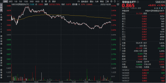 今日(10月20日)A股主要指数集体收红,创业板指涨近2%,科创板亦有亮眼表现,覆盖创业板+科创板高成长龙头的硬科技宽基——双创龙头ETF(588330)场内涨幅一度上探4%,后涨幅略有缩窄,但仍劲涨1.76%,全天成交额4386万元,交投较为活跃。
