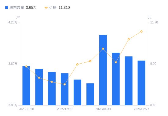 3月2日消息,数据显示,截至2026年2月27日,A股股东总户数为3.65万户,较上期(2026年2月26日)减少607户,降幅1.64%。公司最新A股总股本为5.95亿股,其中流通A股5.95亿股,户均持有流通A股数量为1.63万股,较上期增加267.04股,增幅1.66%;户均持流通A股市值18.46万元,较上期增加8477.54元,增幅4.81%。
