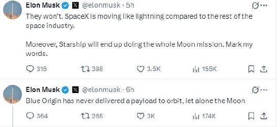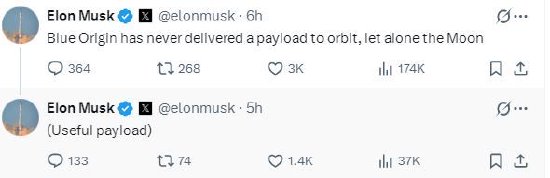 马斯克评论称:“蓝色起源从未将有效载荷送入轨道,更不用说月球了。”他随后补充称:“是有用的有效载荷。”