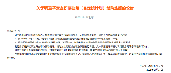 10月21日金融一线消息,发布公告称,由于近期国内金价波动较大,根据黄金积存业务相关监管规定,为顺应市场变化,该行将对该业务做出调整,自2025年10月24日起,平安银行平安金积存业务按金额设定的定投计划起投金额由900元上调至1100元。