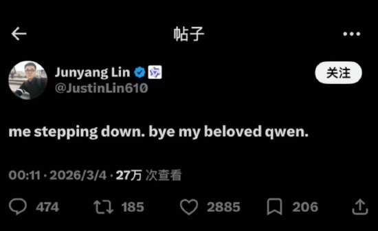 新浪科技讯 3月4日上午消息,通义千问核心负责人林俊旸今日凌晨于X发文表示,自己将从千问项目step down(退下)。其发文道:“me stepping down,bye my beloved qwen”。