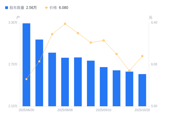 10月21日消息,数据显示,截至2025年10月20日,A股股东总户数为2.56万户,较上期(2025年9月30日)减少359户,降幅1.38%。公司最新A股总股本为6.5亿股,其中流通A股4.64亿股,户均持有流通A股数量为1.81万股,较上期增加250.34股,增幅1.40%;户均持流通A股市值11.01万元,较上期增加4023.18元,增幅3.79%。