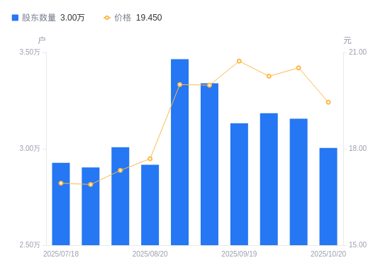 10月21日消息,数据显示,截至2025年10月20日,A股股东总户数为3万户,较上期(2025年10月10日)减少1518户,降幅4.81%。公司最新A股总股本为8.82亿股,其中流通A股4.34亿股,户均持有流通A股数量为1.44万股,较上期增加694.12股,增幅5.05%;户均持流通A股市值28.07万元,较上期减少1199.42元,降幅0.43%。
