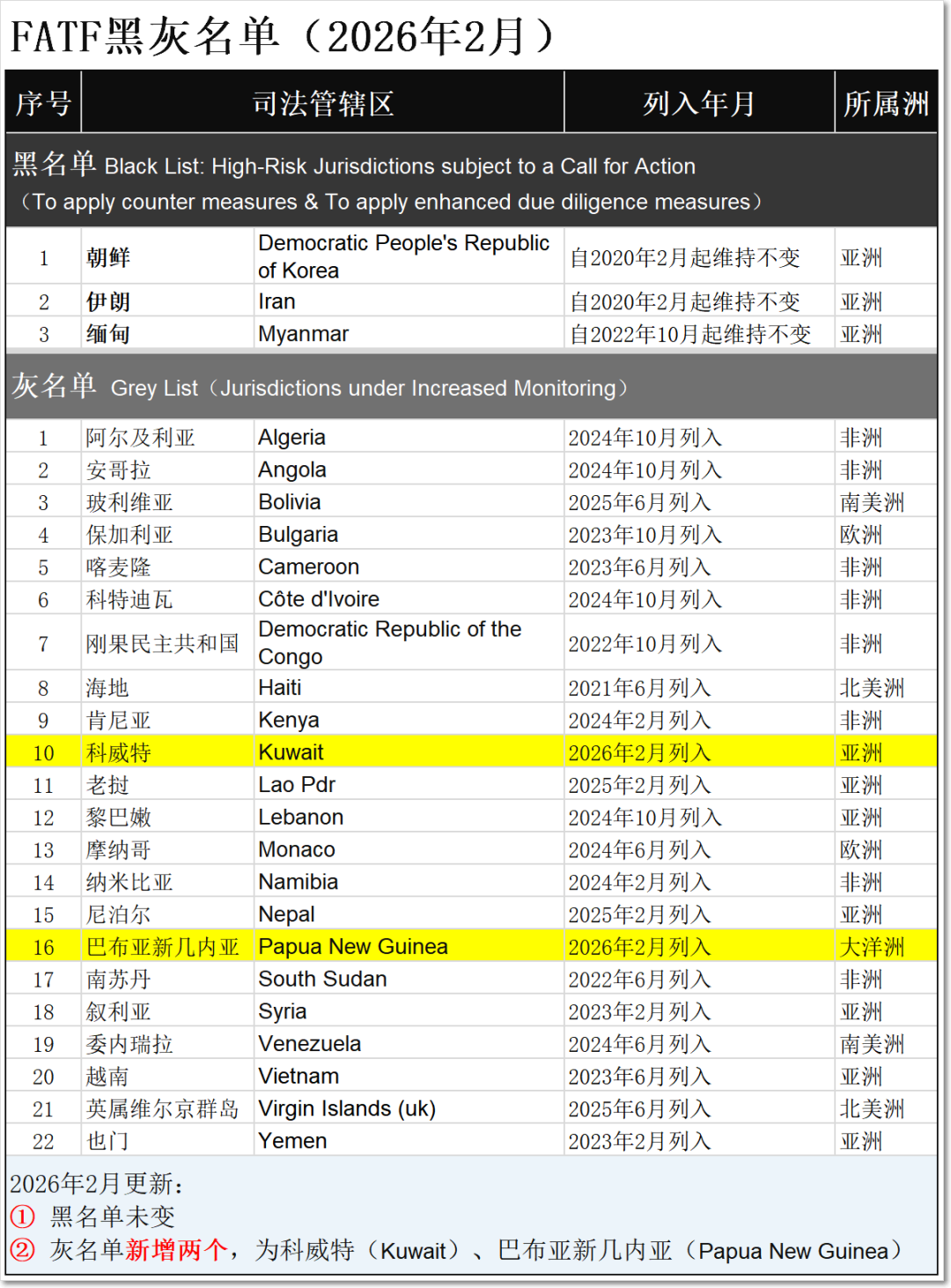 · 灰名单增加两个国家,分别为科威特(Kuwait)、巴布亚新几内亚(Papua New Guinea)。