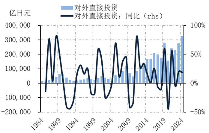 在日本企业两次“出海潮”开启前和出海前期,日元汇率均处于明显的升值阶段,使得日元的购买力增强,对企业出海加速出海起到了一定程度的促进作用,但随着强势日元不断削弱日本商品的出口竞争力,货物贸易顺差趋于收窄,并带动经常账户顺差收窄,而对外直接投资的增加也会导致资本外流的压力增加,对日元形成一定的贬值压力。