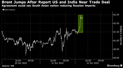 油价上涨,因有报道称美国和印度接近达成一项贸易协议,该协议可能促使这个南亚国家逐步减少俄罗斯原油进口,从而提振替代供应的需求。