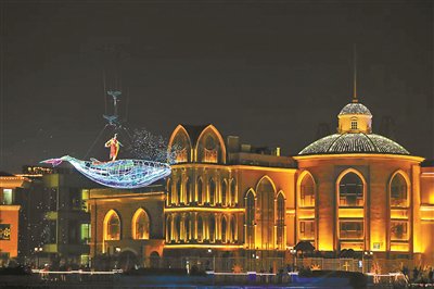 白天秋叶绚烂,夜晚光影流转。夜晚的亮马河畔灯光璀璨,贝壳剧场化作浮光岛屿,舞台与河水连成一幅柔光画布,演员脚踏光束掠过湖面,在水域中央与光景鲲鹏共舞……在2025北京朝阳国际灯光消费季上,本市首个跨水域空中光影表演“飞跃蓝湖”格外吸睛。“这里好多光影设施和表演我都是第一次看到,实在太美了!”游客蒋先生手中的相机一刻都没闲着,“本来还担心晚上没啥可玩的,没想到赶上了灯光节,简直就像童话世界一样,太梦幻太美了!”