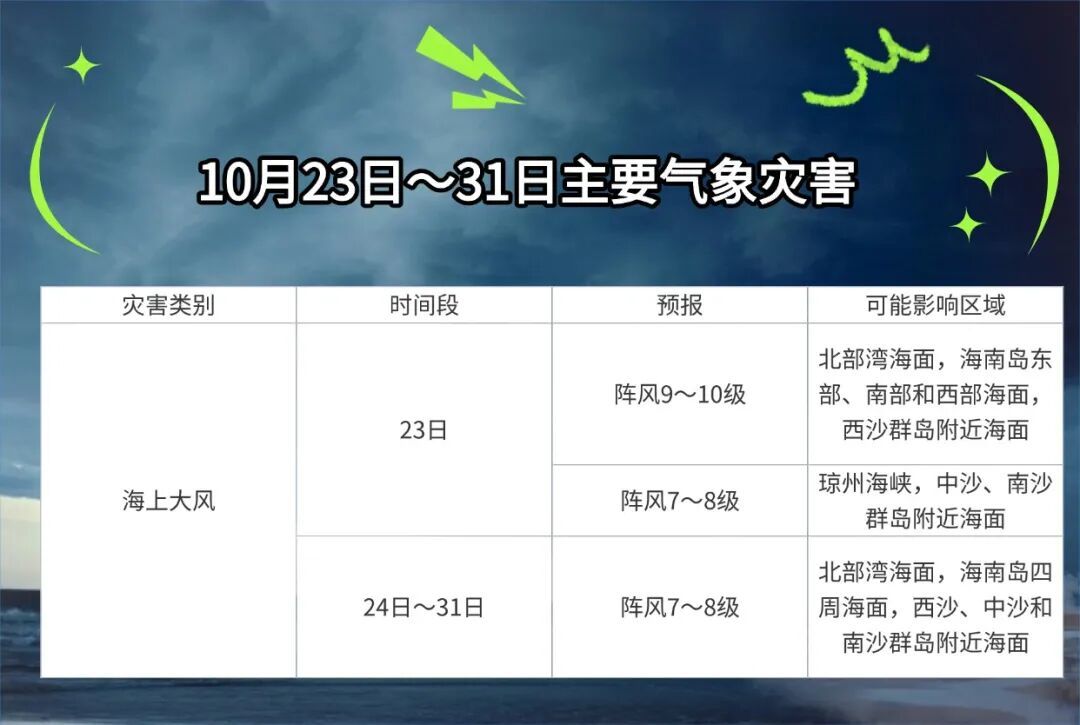 10月23日,北部湾海面,海南岛东部、南部和西部海面,西沙群岛附近海面,风力7~8级、阵风9~10级;琼州海峡,中沙、南沙群岛附近海面,风力5~6级、阵风7~8级。