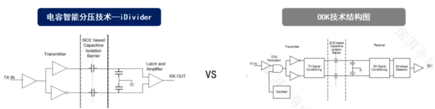 顾名思义,容耦隔离是通过电容耦合器实现,目前主流的技术是采用高频调制解调技术(如OOK)传输数据,如国内隔离芯片龙头在半年报中也将OOK技术列为核心技术之一。