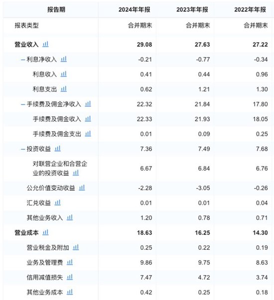 其中,占据营收“大头”的手续费及佣金净收入从2022年末的17.8亿元逐年增长至2024年末的22.32亿元,所占总营收的比重已经从同期的65.39%增长至了76.75%;利息净收入和公允价值变动收益虽然仍处于负值,但已经有了收窄向好的迹象,2024年该公司利息净收入从-0.77亿元收窄至-0.21亿元,公允价值变动从-3.05亿元下降至-2.28亿元;另外,其他业务收入也表现较好,从2022年末的0.71亿元增长至2024年末的1.2亿元,其他项基本保持不变。